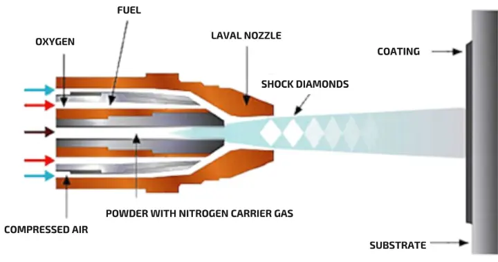 In contrast, HVOF coating relies on a combustion process to heat a feedstock powder, which is accelerated by a high-pressure oxygen-fuel mixture and sprayed onto the substrate at supersonic velocities. This method provides a mechanical bond which relies on friction to adhere the coating material onto the substrate.