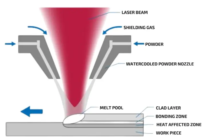 During the laser cladding process, the laser focuses intense energy onto a relatively small heat affected zone (HAZ) of the substrate causing rapid melting and fusion of the surface of the substrate and deposition material. This intense, focused energy input is followed by rapid cooling, which results in the formation of a dense, fine-grain micro-structure with minimal to no cracks or porosity.
